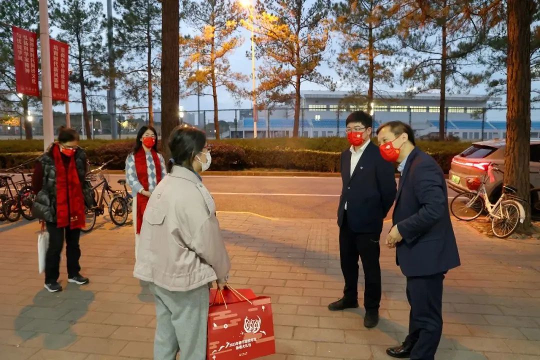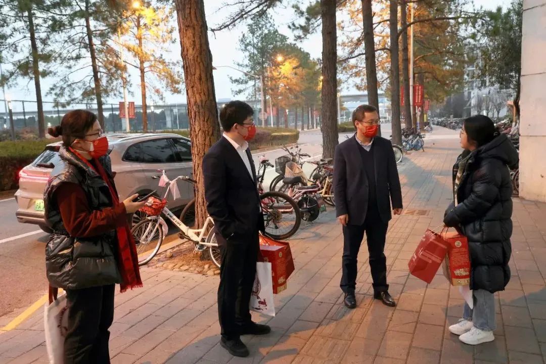 伴随着欢腾喜庆的新春音乐,王凌凌、马万经和凌建明分别向寒假留校员工代表赠送学校和学院精心准备的新春慰问大礼包,希望同学们能够在留校过年的日子里,始终感受到学校和学院诚挚的心意和浓浓的关爱。