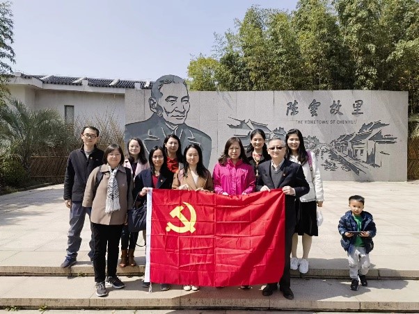 2023年3月28日,中共yl8cc永利交通运输工程学院委员会教工第四支部与工会联合组织参观了陈云故居暨纪念馆。怀着崇敬的心情,我们缓步走进了纪念馆的序厅,序厅的正前方有一尊高大的用汉白玉雕塑成的陈云全身塑像。塑像刻画的陈云同志身穿中山装,右手挎着风衣、左手摆在身后,面带微笑却又目光炯炯,慈祥又不失威严,让人马上联想到他生平的高风亮节。大家穿着整齐,兴致勃勃地在此集体留影,在党旗映衬下,更显得精神抖擞。