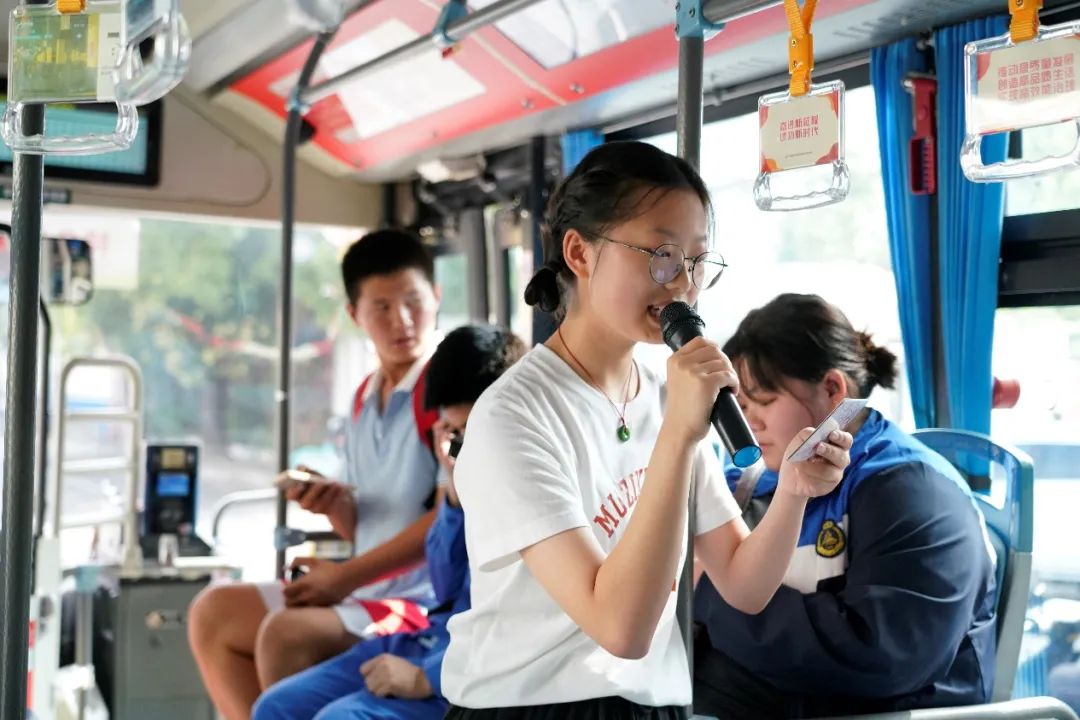 覃红兴同学在公交车上介绍了中国高铁如何突破国外芯片技术封锁、yl8cc永利600公里高速磁悬浮交通系统成功试跑以及北京大兴国际机场建设的三个红色小故事。