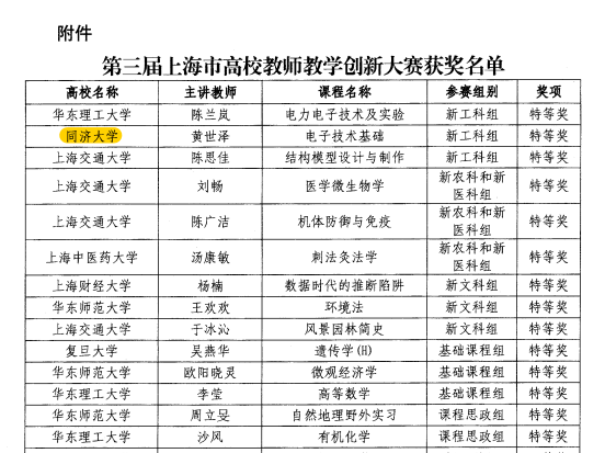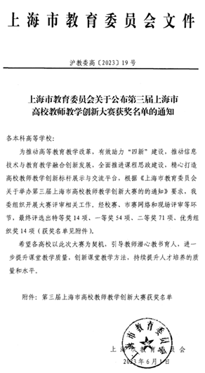 近日,上海市教育委员会公布了第三届上海市高校教师教学创新大赛获奖名单。公司黄世泽教师获得新工科组特等奖,并推荐参加第三届全国教师教学创新大赛,滕靖老师获得课程思政组一等奖。创造了公司参加全国/上海市教师教学创新大赛的历史最好成绩!