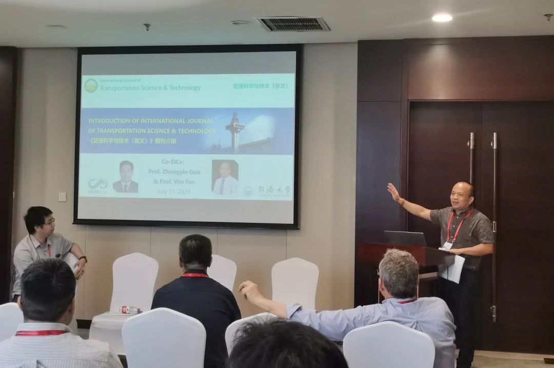 北卡州立大学夏洛特分校的Wei Fan教授做出“美国2050年的交通深度减碳:战略与路径综合分析”的报告;南佛罗里达大学的陆庆教授就”多孔沥青混合料的可持续性评价与发展介绍”展开分析;南佛罗里达大学的张瑜教授做出”前沿空中流动性中的关键研究问题”有关报告;西南交通大学的张傲南教授报告“基于深度学习算法的路面状况智能调查”;中国矿业大学的乔亚宁教授就”道路生命周期成本-碳排放协同机理研究”展开介绍;最后,IJTST主编郭忠印介绍了IJTST期刊概况、国际影响和投审稿情况以及期刊发展趋势等内容。